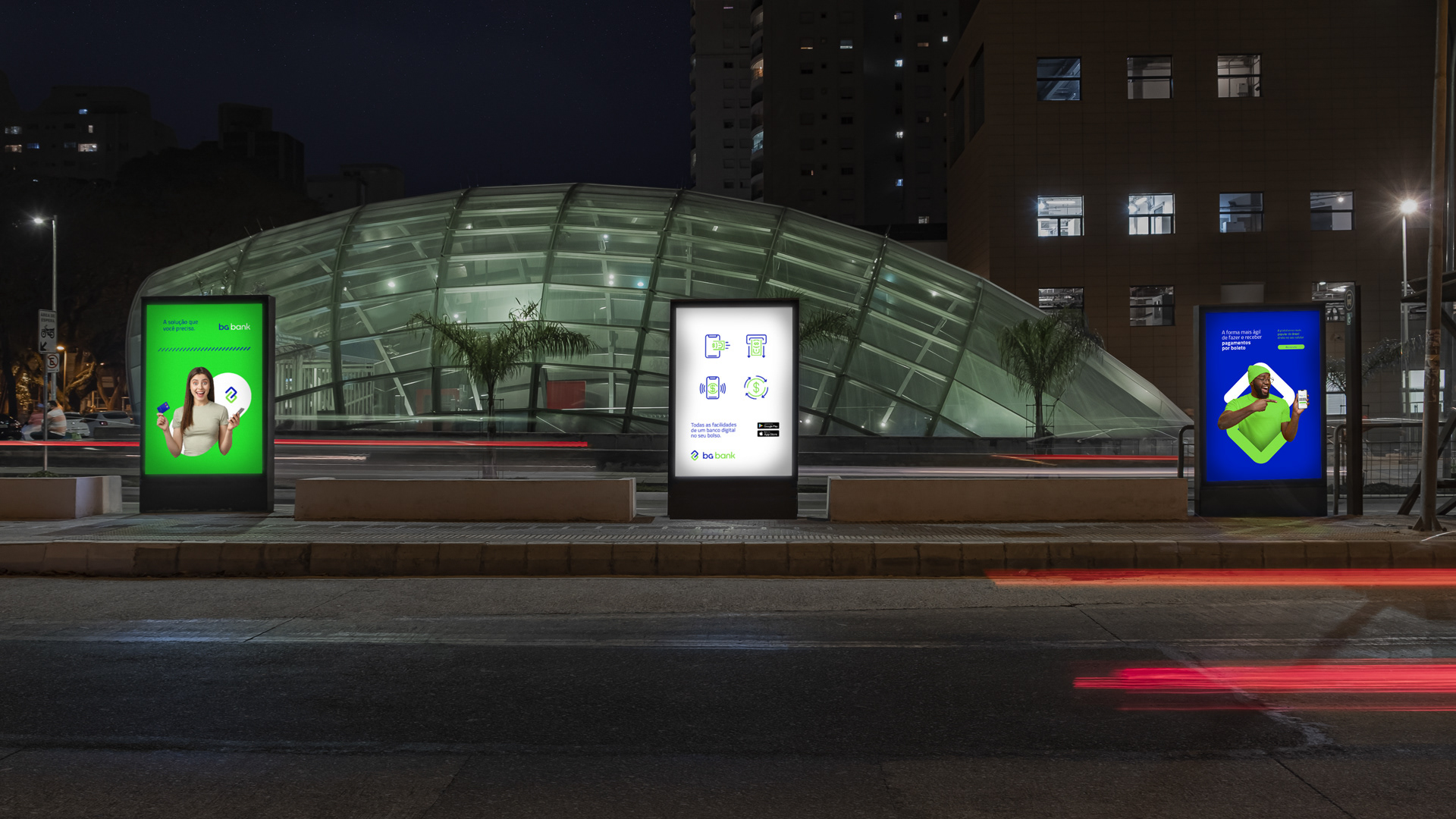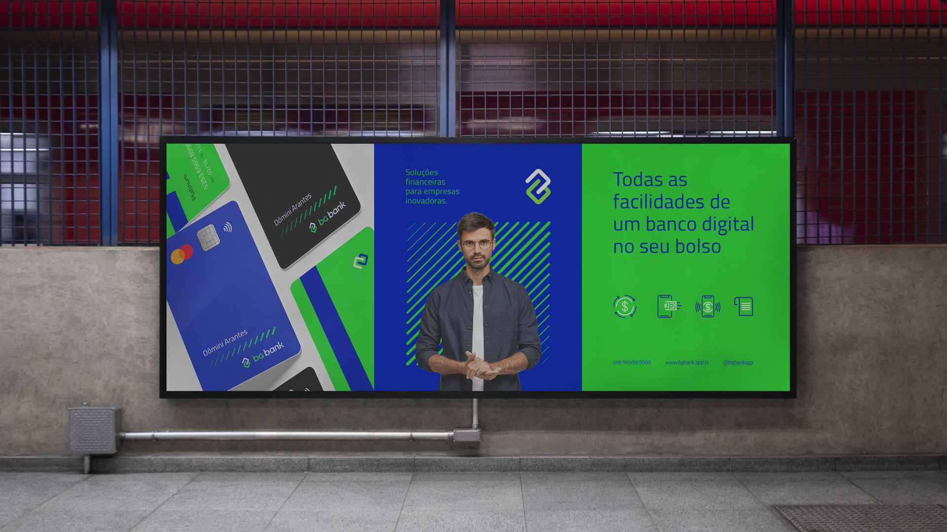 For the construction this new bank's brand identity, differentiation was sought from competitors, and at the same time, were utilized some attributes as parameter, just as: friendly, smart, energetic and tecnological. The logo was inspired in the company's own name, which is the the initials of it's founding partner, Bruno Gonçalves, that's why, in the symbol, can be seen, both a B and a G, a hand can be seen too, holding a credit card, money or a smartphone, which correlates with the main activity of the company.